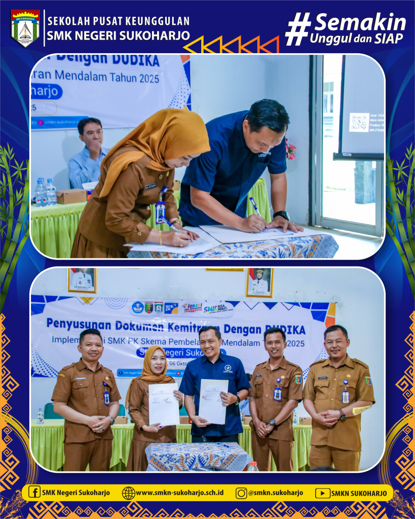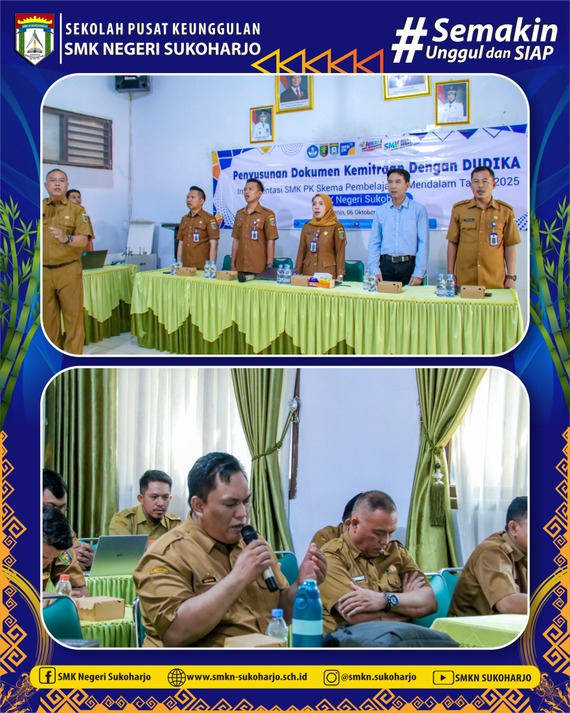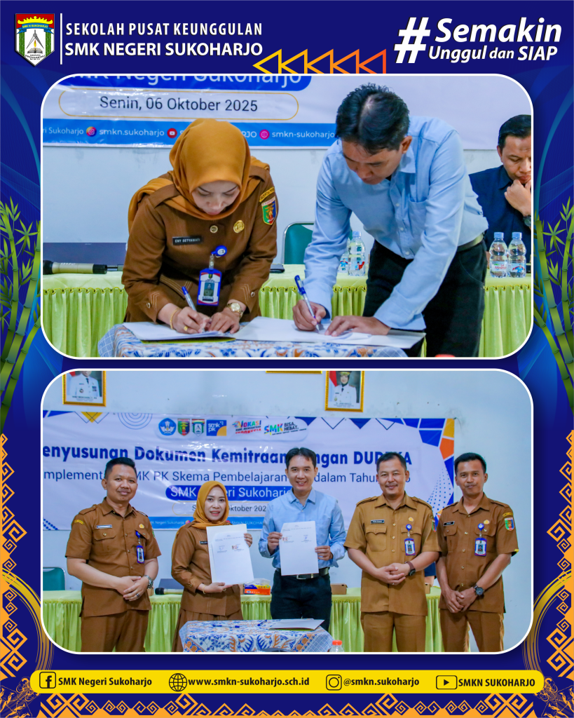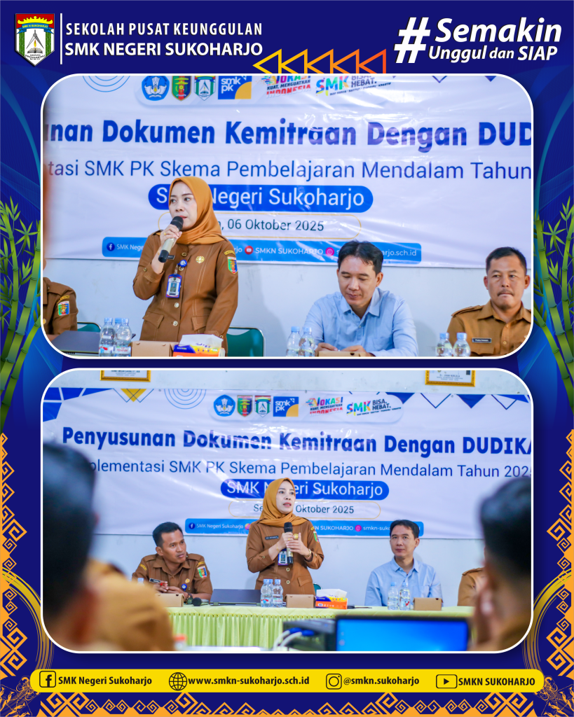 SMKN Sukoharjo melaksanakan kegiatan “Penyusunan Dokumen Kemitraan dengan DUDIKA” pada Senin, 6 Oktober 2025 sebagai bagian dari upaya memperkuat hubungan dan kerja sama antara sekolah dengan Dunia Usaha, Dunia Industri, dan Dunia Kerja (DUDIKA).